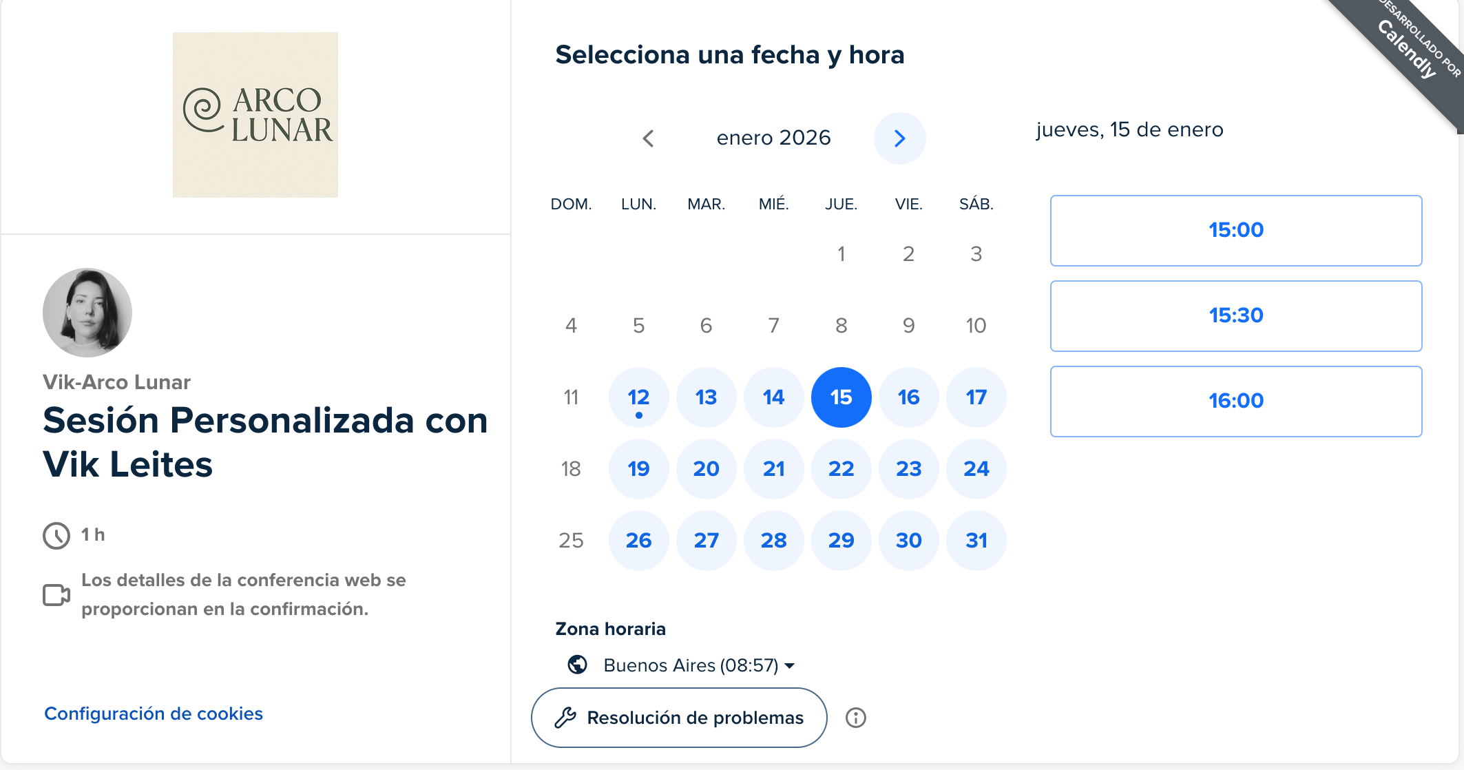 Te dejo un print de pantalla de cómo verás la agenda para reservar tu sesión: